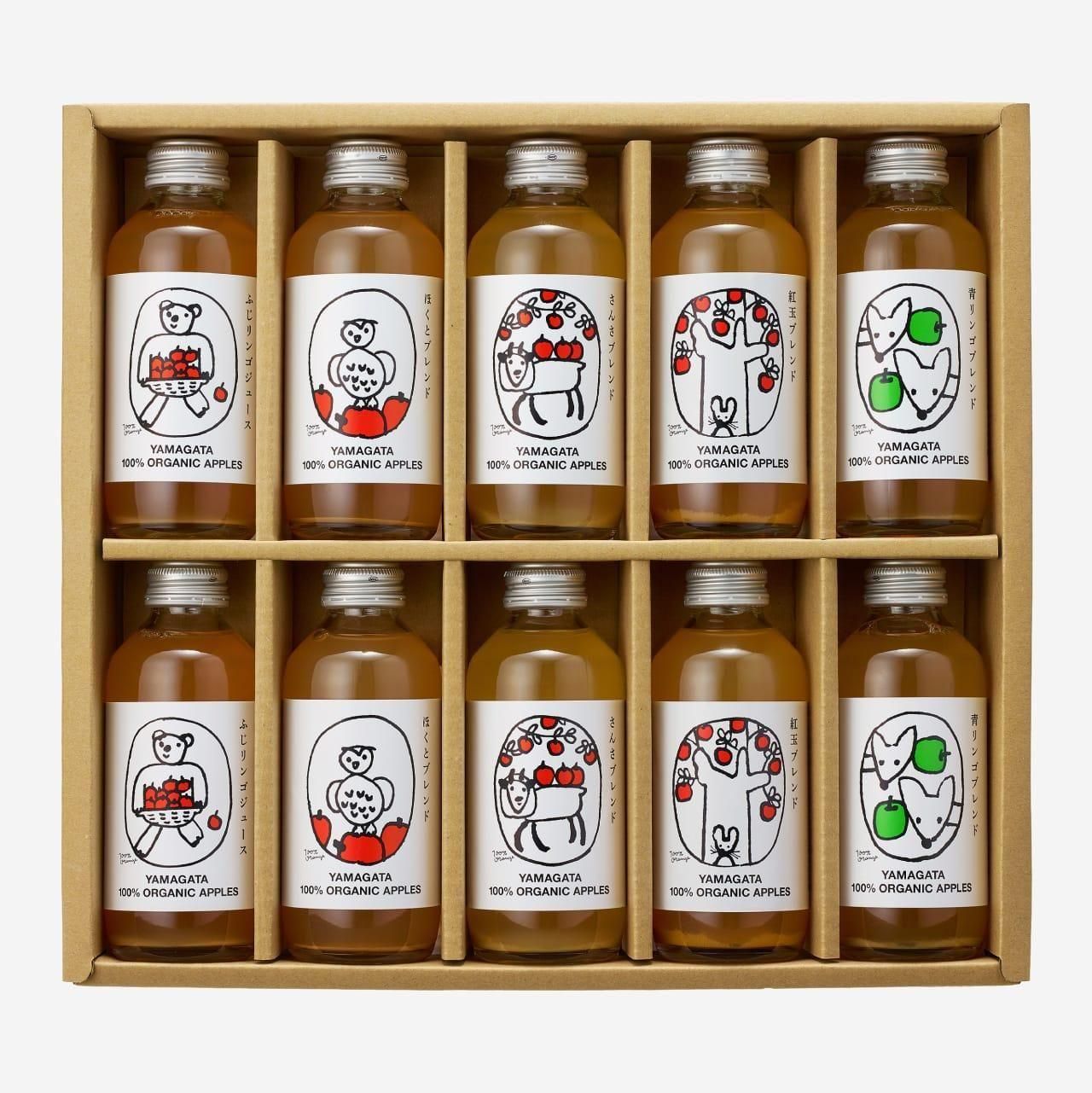 リンゴジュース10本セット。自家農園産の有機栽培リンゴを使用したジュースを特製のギフト箱に入れてお送りいたします。