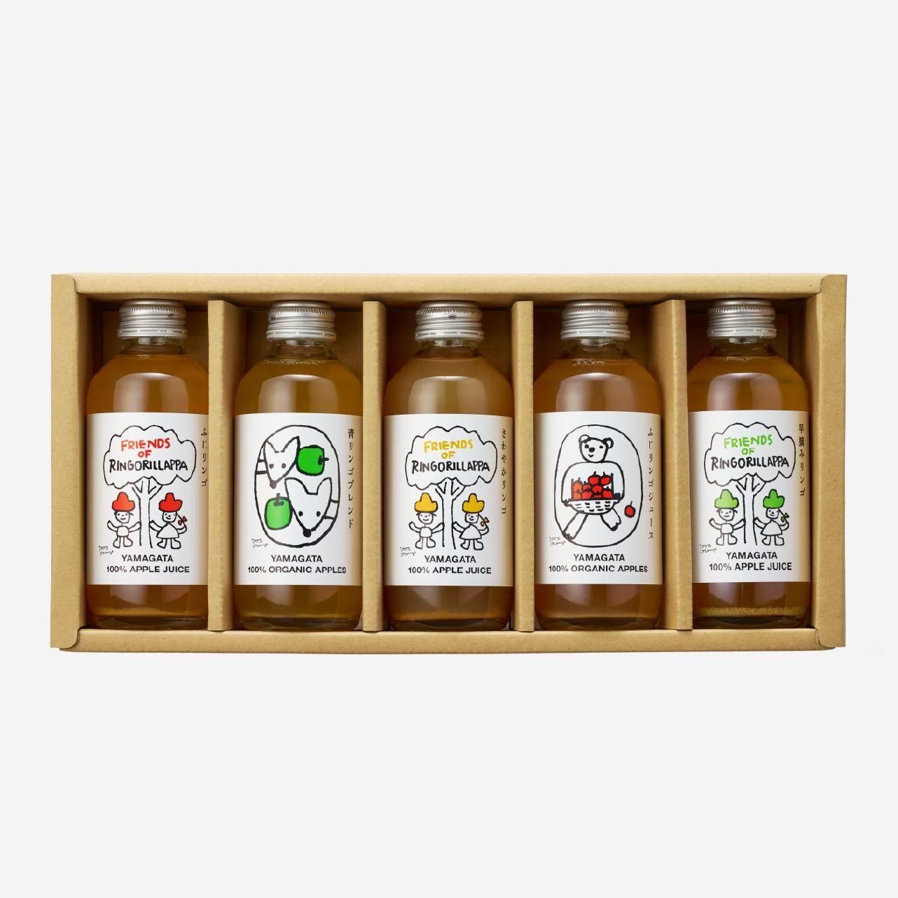 リンゴジュース5本セット。有機栽培リンゴジュースとフレンズジュースのセット入りになります。特製のギフト箱に入れてお送りいたします。